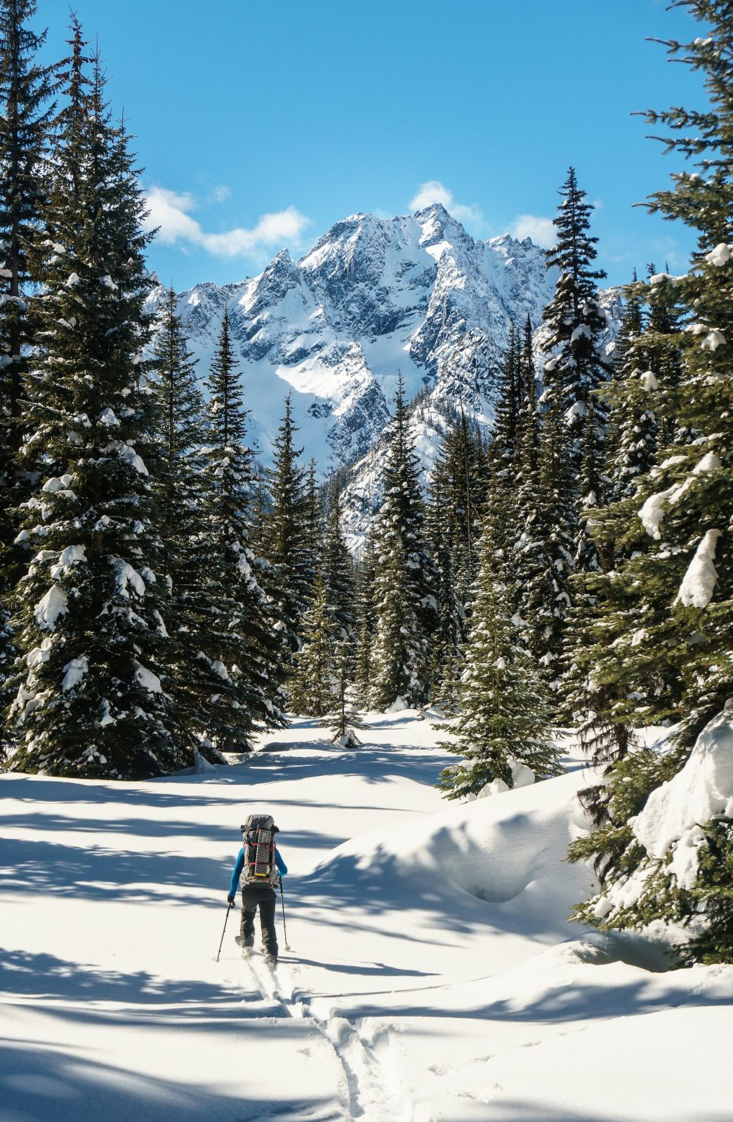 Climbing well means being efficient instead of simply fast. Short, deliberate strides help skins grip, and steady pole plants maintain rhythm on steep ground. Instead of lifting each ski with every step, efficient skinning keeps skis gliding on the snow to save energy. On switchbacks, kick turns allow skiers to change direction easily on narrow tracks.